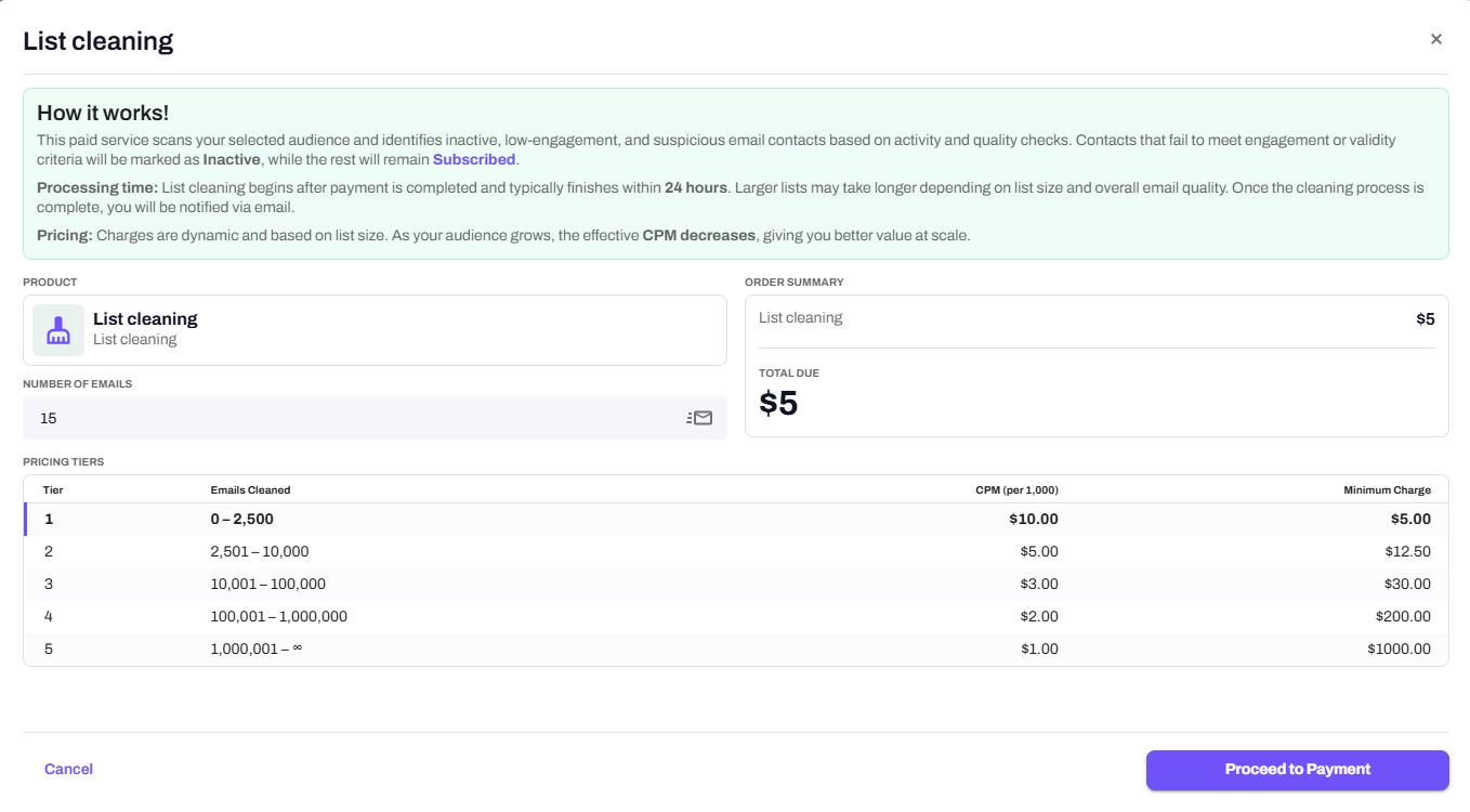 This paid service scans your selected audience and identifies inactive, low-engagement, and suspicious email contacts based on activity and quality checks.
