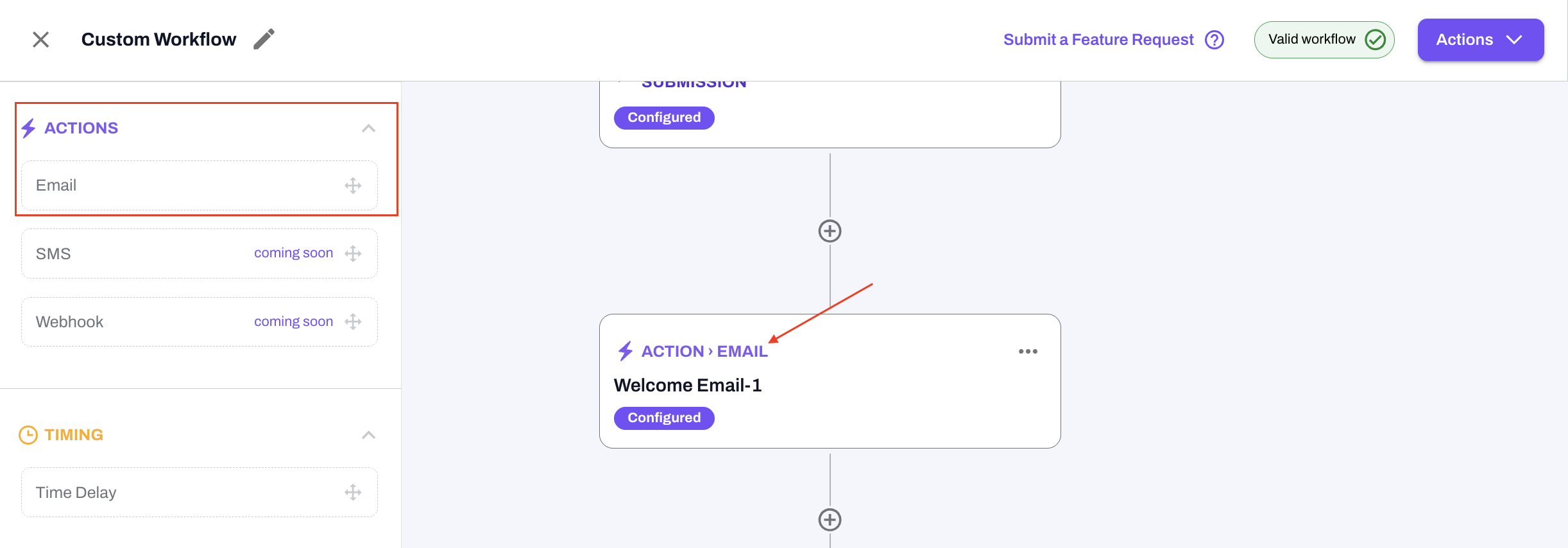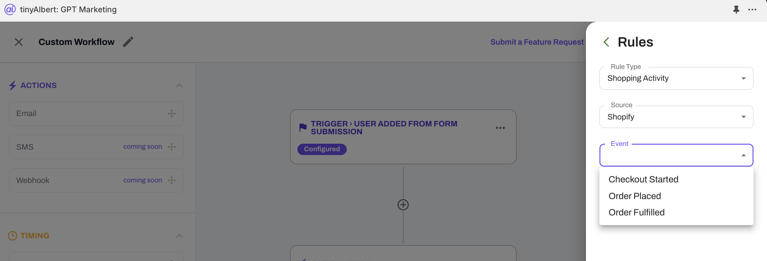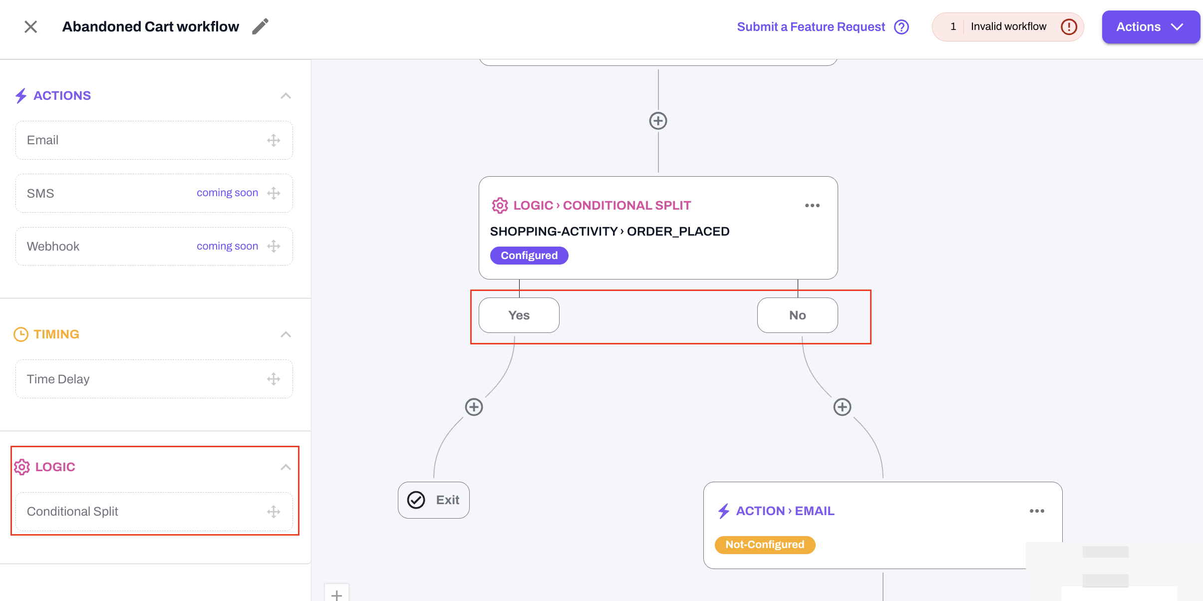 Note: Conditional splits cannot be used when the entry node is "Form Submissions." This functionality only works for workflows initiated by Shopify events.